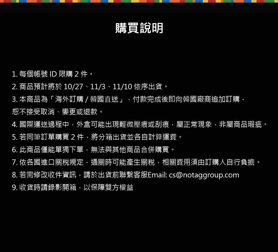 8. 若需修改收件資訊,請於出貨前聯繫客服Email: cs@notaggroup.com
