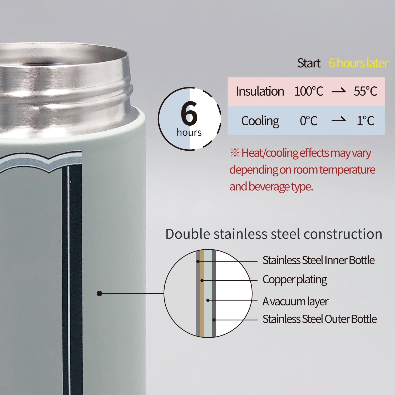 不鏽鋼雙層真空結構,可保持飲品熱/冷長達 6 小時